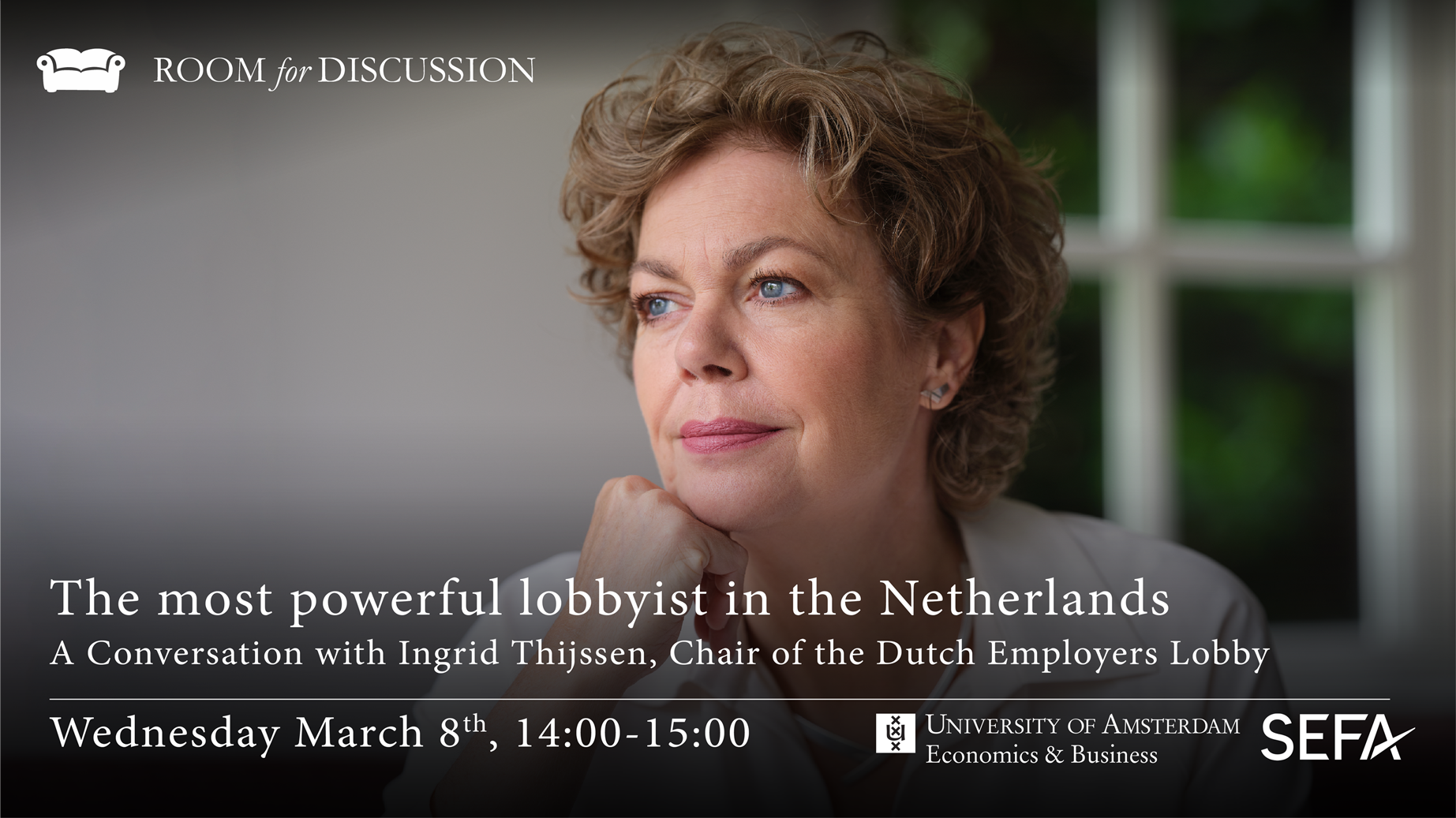 She will be joining us at the Room for Discussion couches on the 8th of March from 14:00-15:00 in the E-hall.